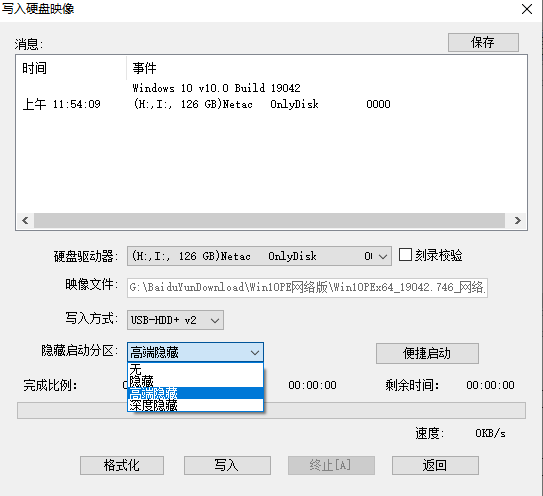 (3)如下图,选择U+V2加高端隐藏写入(注意核实磁盘驱动器确实是U盘,防止操作失误导致其他盘数据丢失,切记!!!!!U盘中如有重要数据,需要转移出去,写入中默认先会格式化U盘)